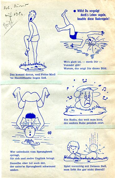 Widmung von Paul Jaster, Leiter des DLRG-Landesverbands Berlin (1953). - Karl Ritter von Halt (vmtl. 1953). - Conte Rodolfo Passerini di Finale, Präsident der Federazione Italiana Nuoto (FIN), Sezione Salvamento (21. Mai 1953, anlässlich der Jubiläums-Bundestagung [Haupttagung] in München). - Dr. Paul Vollmer (DLRG-Präsident), Max Diem (Landesverband Baden), Paul Jaster (DLRG-Vizepräsident), Karl Löhr (Technischer Leiter der DLRG), N. N. Zimmermann, Dr. phil. Robert Goldenring (DLRG-Geschäftsführer), Wilhelm gen. Willi Pöppinghaus (DLRG-Schatzmeister), Arthur Wendelken (Landesverband Bremen), N. N. Kroschel (Landesverband Rheinland-Pfalz), Hans Bals (Landesverband Schleswig-Holstein), Gerd Kowalzig (Arzt im DLRG-Präsidium), N. N. Münch, Ernst Kesselhut (Leiter des Landesverbands Hannover), Heinz Ritzerfeld (Landesverband Nordrhein) sowie Carl Hüttebräucker und Maria Kolbe ("Hüko"); alle Unterschriften anlässlich der DLRG-Bundestagung [Haupttagung] in München am 21. Mai 1953 geleistet. - Prof. Dr. med. Wilhelm Thomsen (DLRG-Präsident), N. N. Zimmermann, R. Häberle (40 Jahre DLRG-Landesverband Württemberg und 40 Jahre DLRG-Bezirk Stuttgart, 25. Okt. 1953). - Prof. Dr. med. Wilhelm Thomsen (DLRG-Präsident), Wilhelm gen. Willi Pöppinghaus (DLRG-Schatzmeister), Marg. Sauerborn, Karl Löhr (Technischer Leiter der DLRG), Gerd [Gerhard] Versteegden, Thea Spoden, Anneliese Ruhe (Jahreshaupttagung des Landesverbands Nordrhein in Duisburg am 8. und 9. Mai 1954). - W. Juilfs (Jahreshauptversammlung des Landesverbands Baden, 20. März 1955). - Wilhelm Ruthenkolk, Marg. Sauerborn (Jahreshauptversammlung des Landesverbands Nordrhein in München Gladbach [Mönchengladbach]), am 23. u. 24. April 1955). - DLRG-Gründungsmitglied Walther Mang (DLRG-Bundestagung in Hameln, Mai 1956). - Rodolfo Passerini di Finale, Prof. Dr. med. Wilhelm Thomsen (DLRG-Präsident), Louise Pitet (Generalsekretärin der Fédération Internationale de Sauvetage et de Secourisme - FISS), Dr. med. Heinz Pohl (DLRG-Vizepräsident), Herbert Schröter (DLRG-Auslandsreferent); Unterschriften anlässlich der internationalen Rettungswettkämpfe und des internationalen Kongresses in Mulhouse [Mülhausen], Frankreich, vom 12. bis 15. Juli 1956, veranstaltet von der FISS (Empfang im Rathaus von Mulhouse, 15. Juli 1956). - "Das habt Ihr ausgezeichnet gemacht! - Euer Präsident" (Prof. Dr. med. Wilhelm Thomsen), Gerd [Gerhard] Versteegden, Thea Spoden, N. N. Klingler, Frau Ritzerfeld, Hellmuth Paulussen und Frau, Marg. Sauerborn, N. N. de Reuter, N. N. Thiel, Günter Puff, Helmut Stoffel, Willi de Reuter, "Zum Wohle von Volk und Vaterland Gottes Segen für Ihr Werk - Mit den besten Wünschen - L. Strochgens, Pfarrer" (Einweihung der DLRG-Rettungsstation Düsseldorf, 5. Juli 1958). - Dr. Friedrich Härting, Beauftragter, Bad Godesberg (Präsidialratstagung und Präsidiumstagung in Essen, Düsseldorf und in der Rettungsschule Oberhausen vom 12. bis 14. März 1960). - Einweihung der DLRG-Station Frankfurt am Main (10. Sept. 1960). - Dr. med. Heinz Pohl (DLRG-Vizepräsident), Klaus Bartnitzke (Pressewart im DLRG-Präsidium), Anneliese Ruhe (DLRG-Frauenwartin), Kurt Matter, Dr. med. Josef Peter Reusch (Trier), Wilhelm gen. Willi Pöppinghaus (Präsidial-Schatzmeister), Karl Löhr (Technischer Leiter der DLRG), Dr. Herbert Müglich (Arzt im DLRG-Präsidium); Unterschriften anlässlich der Präsidiumssitzung in Bad Homburg am 25. und 26. März [1961] sowie anlässlich des 60. Geburtstags des DLRG-Präsidenten Prof. Dr. med. Wilhelm Thomsen. - Dr. Friedrich Härting (Präsidialratstagung in München vom 1. bis 4. Juni 1961). - Harald Kracht (Präsidial-Jugendwart), Anneliese Ruhe (Präsidial-Frauenwartin), Otto Zimmermann (Beisitzer im DLRG-Präsidium und Leiter des DLRG-Landesverbands Württemberg), Dr. Heinz Pohl (2. DLRG-Präsidialarzt), Erich Seifert (stellvertretender Technischer Leiter), Wilhelm Ruthenkolk (Materialstelle Düsseldorf); Unterschriften anlässlich der Präsidialratstagung in Stuttgart, Nov. 1963). - DLRG-Gründungsmitglied Fritz Peter, Louise Pitet (Generalsekretärin der „Fédération Internationale de Sauvetage et de Sports Utilitaires - FIS"), Rittmeister a. D. Ekrem Akömer ("Mitglied der DLRG seit 33 Jahren", Präsident des türkischen Wassersport-Verbandes, Istanbul), Conte Rodolfo Passerini di Finale (Präsident der Sektion Salvamento der Federazione Italiana Nuoto - FIN), José Pascual [wohl José Antonio de Pascual y López-Quesada], Vertreter der Federación Española Salvamento [wohl Federación Española de Salvamento y Socorrismo, Madrid (Spanien)], Eitel-Friedrich Gülsdorff (Vertreter des Landesverbands Schleswig-Holstein), Paul Kellner (Ehrenmitglied der DLRG), Dr. Heinz Pohl (Landesverbandsleiter Nordrhein, 2. Präsidiailarzt); Unterschriften anlässlich des Empfangs der Stadt Stuttgart im Rahmen der DLRG-Jubiläumsveranstaltungen dort (17. Nov. 1963). - Prof. Josef Nikolaus Schmitz, Präsident der DLRG (mit Fotografie), Gebäude Alfredstraße 73, Essen (Präsidial-Geschäftsstelle) seit 1. Juli 1974 Eigentum der DLRG (mit Fotografie), Hans-Joachim Bartholdt, Willy Hickstein, Peter Heidinger (aufgenommen bzw. unterschrieben anlässlich der Präsdialratstagung im neu erworbenen Haus in Essen, Alfredstraße 73, am 5. Okt. 1974). - Klaus Bartnitzke, Hella Lanka, (Tagung des Arbeitskreises Werbemittel und Öffentlichkeitsarbeit, 28. Febr. - 2. März 1975). - Otto Zimmermann, Günter Puff, Clara Schmitz, Hildegard Schenk, B. Ruhrberg, Wilhelm gen. Willi Pöppinghaus, Anneliese Stoffels, Erika Puff, Hannelore Hauschild, Petra Busse, Wolfgang Busse, Ellen Busse, Anni König, Peter König, Hannelore Jünke (Unterschriften anlässlich des 50. Geburtstags von Paul Jünke, DLRG-Geschäftsführer, 12. Okt. 1976). -