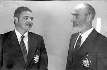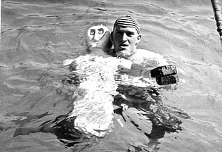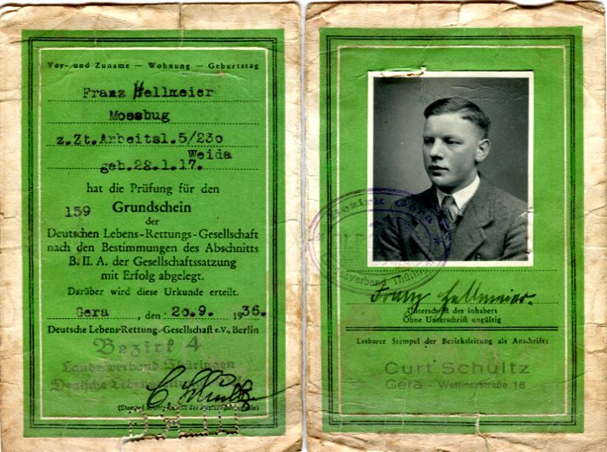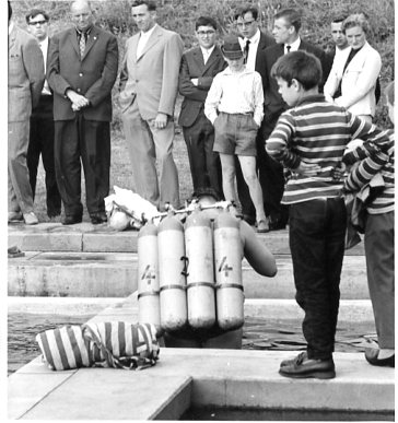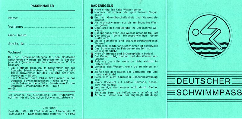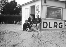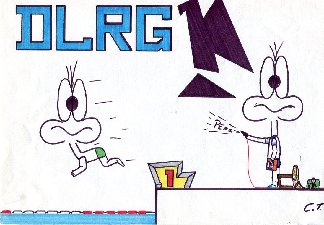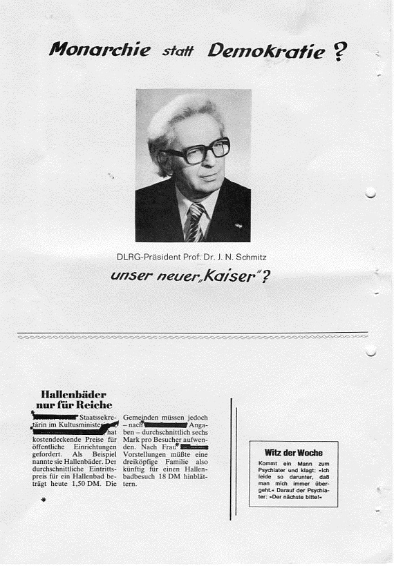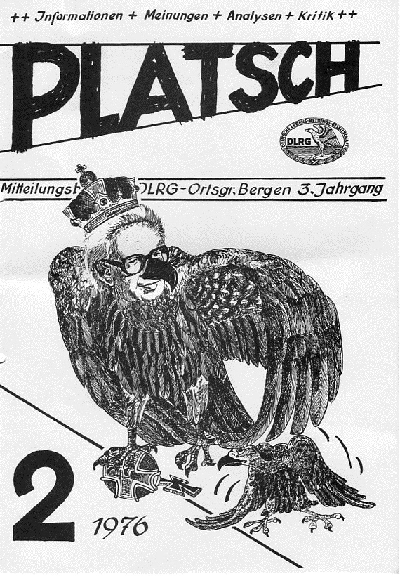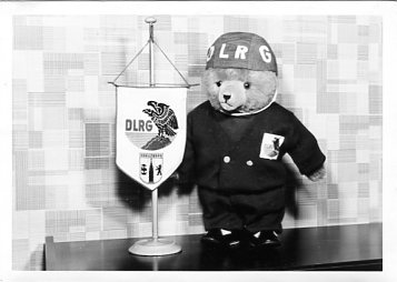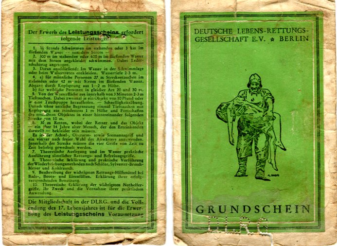 Entwurf für das Titelblatt, angefertigt von Ulrich Schindler, als Nr. Gk-130 zur Graphiksammlung entnommen (12. März 2020/Belli). Sechs Männer üben in einem Freibad (vermutlich in Alfeld [Leine]) ein Verfahren zur Wiederbelebung (Druck einer Fotografie, schwarz-weiß, von Foto E. A. Schütte, Föhrste bei Alfeld [Leine], ca. 1957, mit umseitigem Postkartendruck, frankiert und gelaufen als Ansichtskarte von Erich Beyerlein an Ernst Schindler; Poststempel [20a] Alfeld [Leine], 4. Juli 1958) als Nr. P-262 zur Fotosammlung entnommen (12. März 2020/Belli). Zwei Männer (vermutlich Angehörige einer DLRG-Gliederung) führen Sprünge in einem Freibad (vermutlich in Alfeld [Leine]) anlässlich einer DLRG-Leistungsschau oder bei einer ähnlichen Veranstaltung vor (Druck einer Fotografie, schwarz-weiß, von Foto E. A. Schütte, Föhrste bei Alfeld [Leine], mit umseitigem Postkartendruck, ca. 1957) als Nr. P-263 zur Fotosammlung entnommen.
