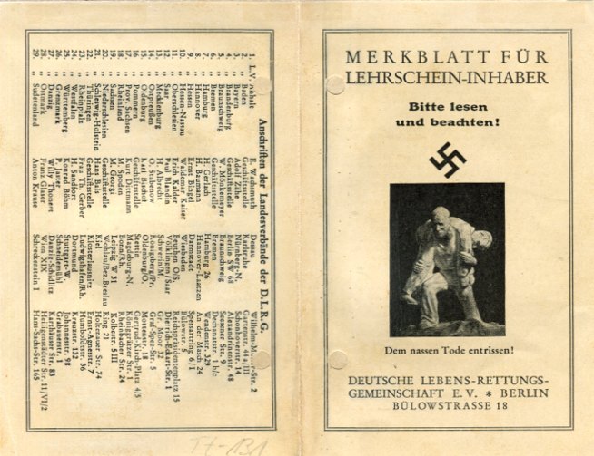 auch: Anschriften der 29 Landesverbände der Deutschen Lebens-Rettungs-Gemeinschaft (D. L. R. G.), Stand ca. Anfang 1939: Landesverband Anhalt, E. Wachsmuth, Dessau, Wilhelm-Müller-Straße 2. - Landesverband Baden, Geschäftsstelle, Karlsruhe, Gartenstraße 44a/III. - Landesverband Bayern, Adolf Zähe, Nürnberg-N., Schonhoverstraße 14. - Landesverband Brandenburg, Geschäftsstelle, Berlin SW 68, Alexandrinenstraße 48. - Landesverband Braunschweig, W. [Wilhelm] Mönkemeyer, Braunschweig, Seesener Straße 9. - Landesverband Bremen, Geschäftsstelle, Dechanatstraße 1 b/c. - Landesverband Hamburg, H. Gerlach, Hamburg 26, Wendenstraße 329. - Landesverband Hannover, H. Baumann, Hannover-Laatzen, An der Masch 24. - Landesverband Hessen, Ernst Bingel, Darmstadt, Spessartring 6/I. - Landesverband Hessen-Nassau, Waldemar Kaiser, Wiesbaden, Bülowstraße 5. - Landesverband Oberschlesien, Erich Kalder, Beuthen (Oberschlesien), Reichspräsidentenplatz 15. - Landesverband Saar, Paul Blandin, Völklingen/Saar, Dietrich-Eckart-Straße 1. - Landesverband Mecklenburg, H. Albrecht, Schwerin/M., Gr. Moor 32. - Landesverband Ostpreußen, O. Stabenow, Königsberg in Preußen, Graf-Spee-Straße 5. - Landesverband Oldenburg, Karl Bischof, Oldenburg i. Oldbg., Mottenstraße 18. - Landesverband Pommern, Geschäftsstelle, Stettin, Gertrud-Kirch-Platz 4 u. 5. - Landesverband Provinz Sachsen, Kurt Dittmann, Magdeburg-N., Königgrätzer Straße 1. - Landesverband Rheinland, M. Spoden [Michael Spoden], Bonn/Rheinland, Rheinbacher Straße 24. - Landesverband Sachsen, M. Georgi, Leipzig W 31, Kolbestraße 5/III. - Landesverband Niederschlesien, Geschäftsstelle, Wohlau/Bez. Breslau, Ring 21. - Landesverband Schleswig-Holstein, Hans Bals, Kiel, Holtenauer Straße 74. - Landesverband Thüringen, Geschäftsstelle, Klosterlausnitz [Bad Klosterlausnitz], Ernst-Agnes-Straße 7. - Landesverband Rheinpfalz, Frau Th. Gerber, Ludwigshafen/Rheinpfalz, Humboldtstraße 36. - Landesverband Westfalen, H. Sandfort, Dortmund, Kreuzstraße 132. - Landesverband Württemberg, Konrad Böhm, Stuttgart-W., Johannesstraße 98. - Landesverband Grenzmark [Grenzmark Posen-Westpreußen], P. Jaster, Schneidemühl, Grabauer Straße 1. - Landesverband Danzig, Willy Thonert, Danzig-Schidlitz, Karthäuser Straße 83. - Landesverband Ostmark, Franz Glaser, Wien XIX, Heiligenstädter Straße 11/VI/2. - Landesverband Sudetenland, Anton Krause, Schreckenstein I, Hans-Sachs-Straße 165.