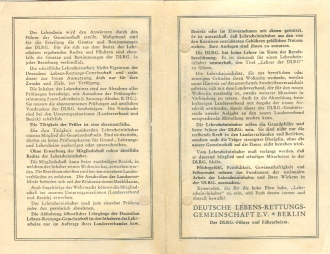 Übergang der schriftlichen Lehrscheinarbeit in das Eigentum der D. L. R. G. - Berechtigung zur Abnahme von Prüfungen. - Notwendigkeit der Zugehörigkeit zur D. L. R. G. (zwingende Mitgliedschaft im Verband). - Verbot zur Führung der Bezeichnung "Lehrer der DLRG [D. L. R. G.]". - An- und Abmeldeverfahren bei Wohnortwechsel. - ethische Anforderungen an Lehrscheininhaber.