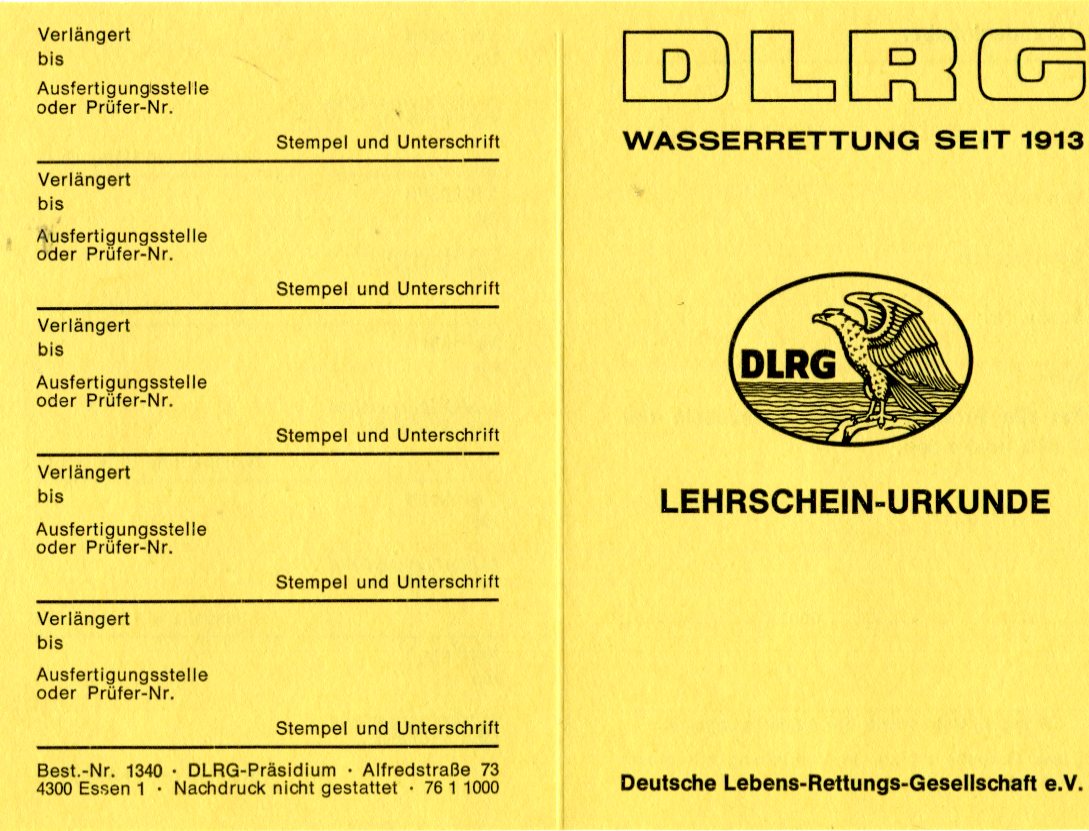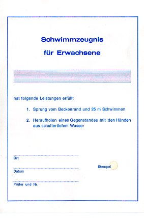 Schwimmzeugnis für Erwachsene (Testat, blanko, Druckstück, herausgegeben vom Präsidium der DLRG, Bestellnummer 1305 der DLRG-Materialstelle)