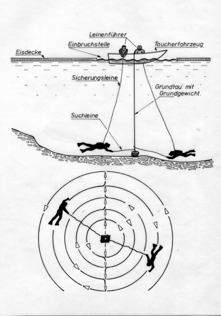 Leinenführer. - "Taucherfahrzeug" (Boot). - Sicherungsleine. - Suchleine. - Grundtau mit Grundgewicht.