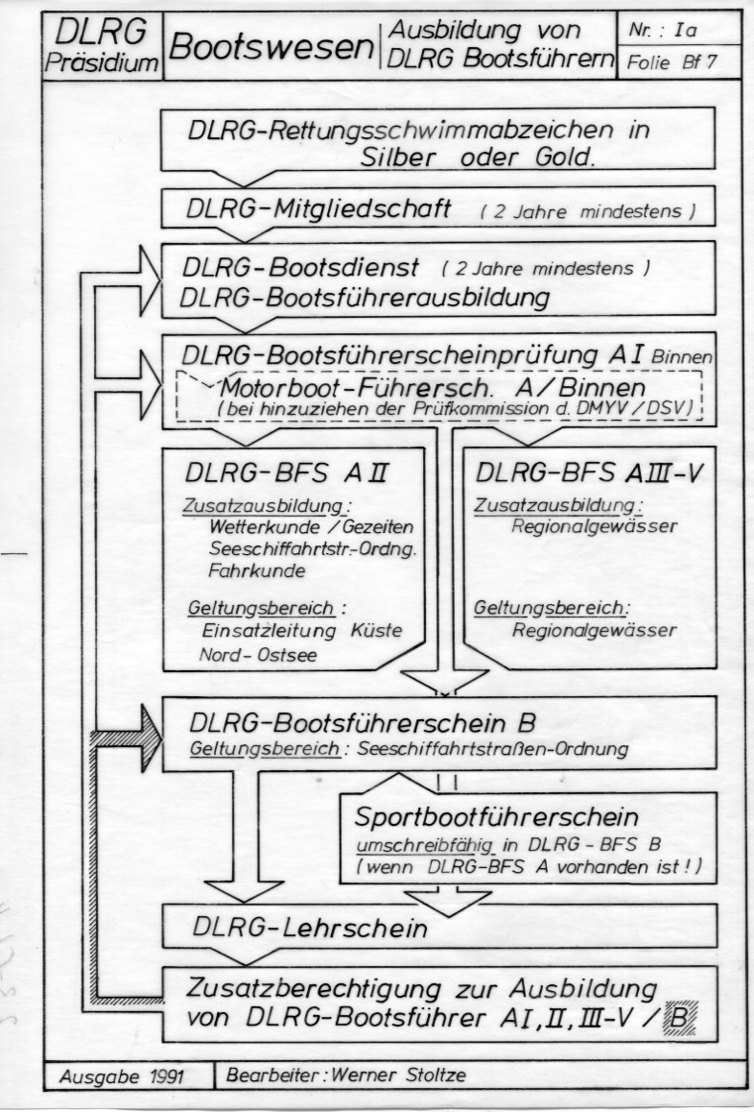 Schema zur Bootsführerausbildung in der DLRG (Kopiervorlage, Tusche, schwarz, auf Transparentpapier, erstellt von dem Bootsfachmann Werner Stoltze, Braunschweig, Mitglied der DLRG)