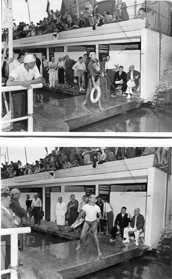 Sportler bei Ausführung der Wettkampfdisziplin Rettungsringweitwurf, beobachtet von Conte Rodolfo Passerini di Finale (Technischer Leiter der Sezione Salvamento der italienischen Wasserrettungsgesellschaft Federazione Italiana Nuoto [FIN] und Vizepräsident der Fédération Internationale de Sauvetage et de Secourisme [FISS]), aufgenommen bei den von der Fédération Nationale de Sauvetage (F. N. S.), Paris (Frankreich), und von der FISS in Nogent-sur-Marne (Frankreich) vom 1. bis 6. September 1955 veranstalteten nationalen und internationalen Wettkämpfen (Fotografien, Abzüge, schwarz-weiß)