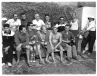 Sportler, darunter Mitglieder der italienischen Mannschaft, sowie Conte Rodolfo Passerini di Finale (Technischer Leiter der Sezione Salvamento der italienischen Wasserrettungsgesellschaft Federazione Italiana Nuoto [FIN] und Vizepräsident der Fédération Internationale de Sauvetage et de Secourisme [FISS]) und ein weiterer italienischer Funktionär, aufgenommen bei den von der Fédération Nationale de Sauvetage (F. N. S.), Paris (Frankreich), und von der FISS in Nogent-sur-Marne (Frankreich) vom 1. bis 6. September 1955 veranstalteten nationalen und internationalen Wettkämpfen (Fotografie, Abzug, schwarz-weiß)