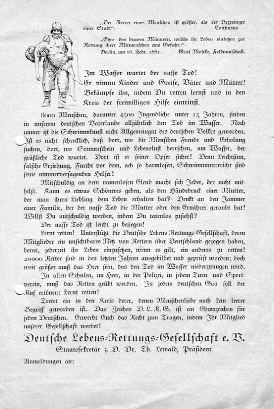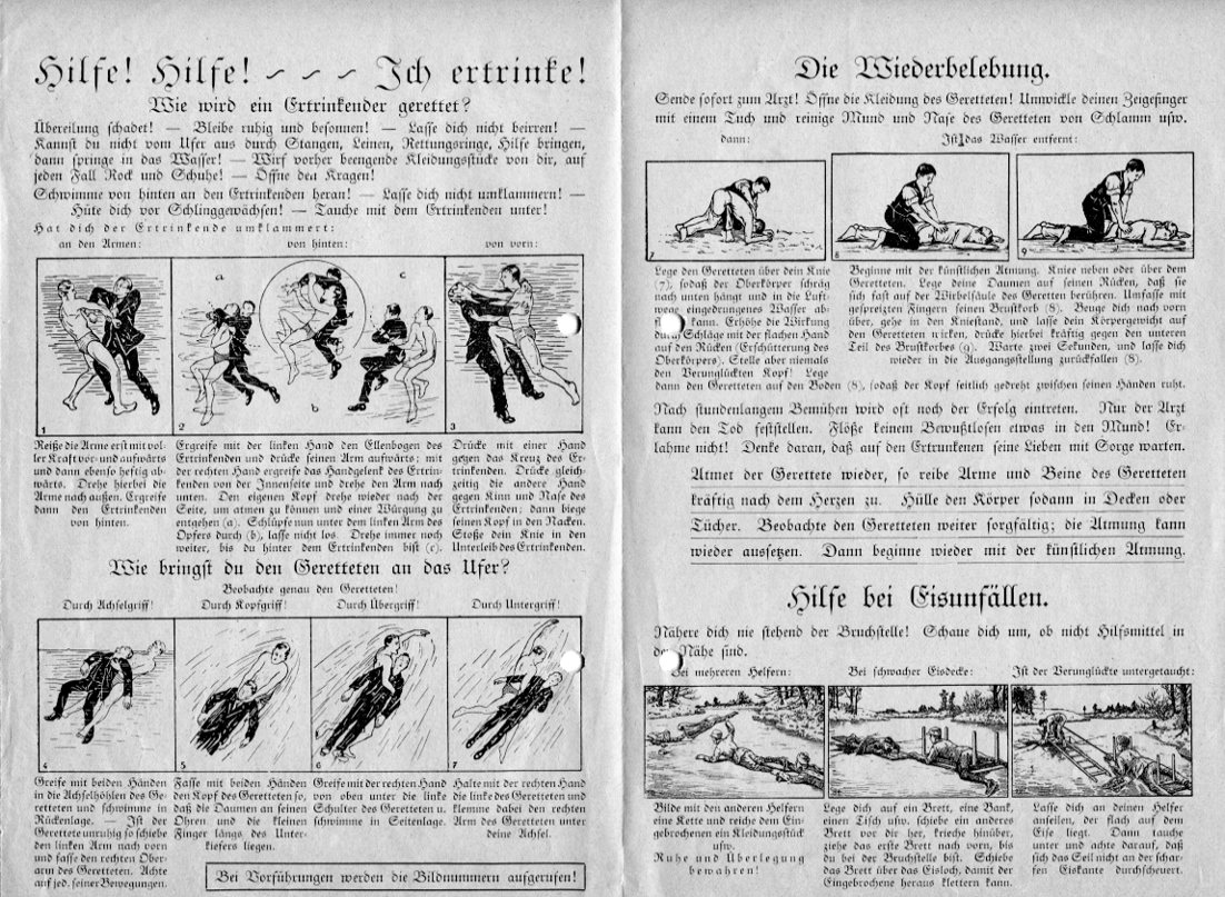 auch: Kassenvorschrift für die Bezirke und Zweigstellen im Landesverband Nord-Rhein der DLRG nebst Erläuterungen, verfasst von Wilhelm gen. Willy Pöppinghaus, Kassenwart des Landesverbands, Mai 1948 (Bl. 2 - 8). - Vorgaben für den Kassenabschluss in Reichsmark (RM) per 20. Juni 1948 und zum Umgang mit noch vorhandenen Wertmarken (Beitragsmarken) in diesem Zusammenhang, verfasst von Wilhelm gen. Willy Pöppinghaus, Kassenwart des Landesverbands, Dez. 1948 (Bl. 10). - Materialverbrauch der Bezirke in den Jahren 1938, 1939, 1940, 1941 und 1942, Aufstellung, Jan. 1943 (Bl. 36). - Bezirke im Landesverband der Deutschen Lebens-Rettungs-Gemeinschaft (D. L. R. G.), Aufstellung, ca. 1942 (Bl. 37). - Materialverbrauch der Bezirke in den Jahren 1939, 1940, 1941, 1942 und 1943 (einschließlich Bezirk "Arbeitsgau 21" und Bezirk "Arbeitsgau 24"), Aufstellung, Jan. 1944 (Bl. 39). - Abrechnung der der DLRG-Arbeitsgemeinschaft für die vereinigten Zonen (Sitz Wiesbaden) zustehenden Beitragsanteile aus dem Bereich des Landesverbands Nordrhein für das Jahr 1948, März 1949 (Bl. 84). - Jahreskassenabschluss der Materialbeschaffungsstelle [Materialstelle] Düsseldorf der DLRG-Arbeitsgemeinschaft für die vereinigten Zonen per 31. Dez. 1948 (Bl. 87), dortiger Materialbestand per 2. Jan. 1949 (Bl. 88) und Außenstände der Materialbeschaffungsstelle per 31. Dez. 1948 (Bl. 89). - Verteilung von Lotteriegeldern (Sportwetten) an bedürftige Bezirke, Juni 1949 (Bl. 90). - Bitte um Übermittlung von Freigabebescheinigungen für gesperrte Konten, gerichtet an die Kreissparkasse Bonn, Juli 1948 (Bl. 91). - Preise für Material, das von der Hauptgeschäftsstelle [Reichsgeschäftsstelle] Berlin bezogen werden kann, detaillierte Preisliste, Stand Apr. 1937 (Bl. 92ff.). - Jahresbericht des Rettungswartes des DLRG-Landesverbands Nordrhein-Westfalen, Herbert Völsch, Krefeld, für 1947 (darin erwähnt: ausgestellte Grundscheine, Leistungsscheine und Lehrscheine; Rettungsdienst [Rettungswachdienst], Rettungsmittel, Werbeveranstaltungen, Entwicklung von Mitgliederzahlen in Bezirken; "Verhältnis zu den Schwimmvereinen"; Unterstützung durch Behörden; "Presse-Werbung"), Bl. 95ff. - "Retten im Strom; zusammengestellt für die Rettungswache am Rhein von Lehrscheininhaber Sarafin, Bezirk Dinslaken, im Landesverband Nordrhein der DLRG", ca. Aug. 1948 (Bl. 99 - 103). - Protokoll über die Landesverbandstagung (Landesverband Nordrhein) in Düsseldorf am 27. März 1949 (ausführliche Darstellung des Sach- und Diskussionsstandes zum Thema Wiederbelebung nebst Injektionen; Forderungen an die ethische Einstellung und an das Agieren von Lehrscheininhabern; Einsatz des "Tauchretters"), Bl. 108 - 114. - III. Rundschreiben des Landesverbands Nordrhein, Mai 1948 (aus dem Inhalt: Bitte um Sammlung von Altpapier und Übermittlung an die Materialbeschaffungsstelle [Materialstelle]), Bl. 120. - Protokoll über die in Düsseldorf am 8. Mai 1948 abgehaltene Hauptversammlung des Landesverbands Nordrhein (aus dem Inhalt: Anwesenheit von Ministerialrat Dr. Mallwitz [Dr. med. Arthur Mallwitz], Schwierigkeiten bei den Bemühungen um die Erlangung der Erlaubnis zur Wiederaufnahme der Arbeit der DLRG nach dem Zweiten Weltkrieg; Wahl von Waldemar Briel, Düsseldorf, zum neuen Rettungswart des Landesverbands; Versicherung von Rettungsschwimmern; Bericht über die Tätigkeit der DLRG-Arbeitsgemeinschaft für die vereinigten Zonen nebst Wahl von Adolf Philippi zum Vizepräsidenten der DLRG, Suche nach einem geeigneten Präsidenten für die DLRG und Vereinnahmung des DLRG-Landesverbands Bayern durch das Bayerische Rote Kreuz; "Politische Richtlinien" [sog. Entnazifizierung]), Bl. 121 - 125. - Rundschreiben des Landesverbands Nordrhein Nr. IV/1948, Juli 1948 (aus dem Inhalt: Folgen der unzureichenden Aufwertung sog. Altkonten im Zuge der Währungsreform; Zusammenschluss der DLRG-Landesverbände Baden, Bayern, Bremen, Hamburg, Hessen, Niedersachsen, Nordrhein, Schleswig-Holstein, Westfalen und Württemberg in der DLRG-Arbeitsgemeinschaft für die vereinigten Zonen), Bl. 126. - Rundschreiben des Landesverbands Nordrhein Nr. I/1949, Febr. 1949 (Bl. 164). - Dsgl. Nr. III/1949, Mai 1949 (Bl. 165). - Dsgl. Nr. IV/1949, o. D. (aus dem Inhalt: Wiederwahl von Heinz Ritzerfeld zum stellvertretenden Leiter des Landesverbands Nordrhein; Wahl von Dr. med. Heinz Pohl zum Ärztlichen Beirat des Landesverbands Nordrhein; Wahl von N. N. Steuth zum Presse- und Werbewart des Landesverbands Nordrhein; verbindliche Verwendung der Bezeichnung "Zweigstelle" anstatt der Bezeichnung "Ortsgruppe"), Bl. 166f. - Rundschreiben des Landesverbands Nordrhein Nr. V/1949, Juni 1949 (Bl. 171). - Dsgl. Nr. VI/1948, Dez. 1948 (Bl. 184). - Protokoll über die Jahreshauptversammlung des Landesverbands Nordrhein in Dinslaken am 21. und 22. Mai 1949 (Bl. 185). - Protokoll über die Jahreshauptversammlung des Landesverbands Nordrhein in Düsseldorf am 29. Juni 1947 (aus dem Inhalt: Beschluss des DLRG-Landesverbands Groß-Hessen betreffend die Umbenennung [Rückbenennung] der Deutschen Lebens-Rettungs-Gemeinschaft [D. L. R. G.] in Deutsche Lebens-Rettungs-Gesellschaft), Bl. 192. - Rundschreiben des Landesverbands Nordrhein-Westfalen Nr. I/1947, Dez. 1947 (aus dem Inhalt: Aufforderung zum Sammeln und Abliefern von Altpapier und Altmetall; endgültige Lizenzierung / Genehmigung des Landesverbands Nordrhein-Westfalen durch Schreiben der Militärregierung vom 14. Okt. 1947), Bl. 194.