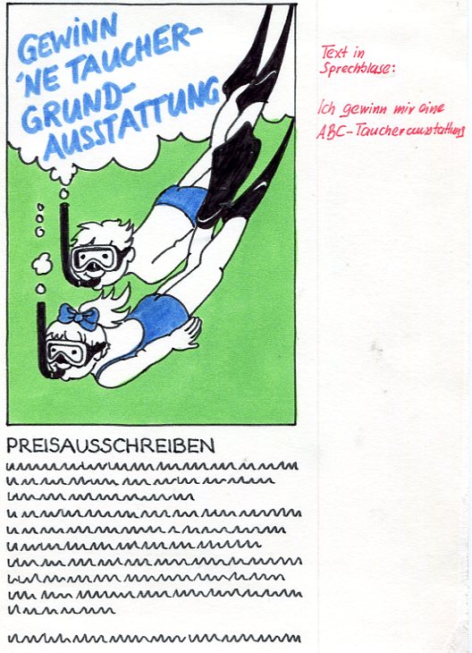 Entwurf des Deckblatts (?) für ein Preisausschreiben für eine Tauchergrundausstattung, erstellt von Inge Klein, Mülheim an der Ruhr (Handzeichnung, farbig) zwecks Verwendung im Rahmen des Tages der DLRG-Jugend