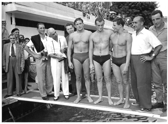 Walther Mang im Gehrock und mit Aktentasche an der Hand; vermutlich aufgenommen anlässslich der 46. Deutschen Schwimm-Meisterschaften (Königsberg i. Pr., 1. bis 2. August 1931) oder im Rahmen des dort mutmaßlich parallel abgehaltenen Verbandsfestes des Deutschen Schwimm-Verbands (DSV), abgedruckt in der DLRG-Verbandszeitschrift "Der Lebensretter", Heft Mai 1961, S. 160 (Datei)
