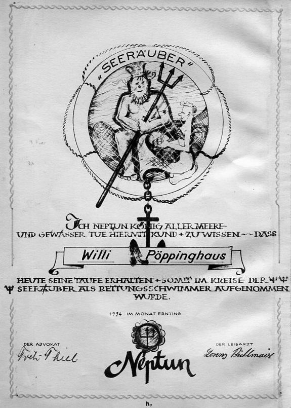 Urkunde (dreifarbig) über die Aufnahme von Wilhelm gen. Willi Pöppinghaus in den Kreis der "Seeräuber" (nach erfolgter "Taufe")