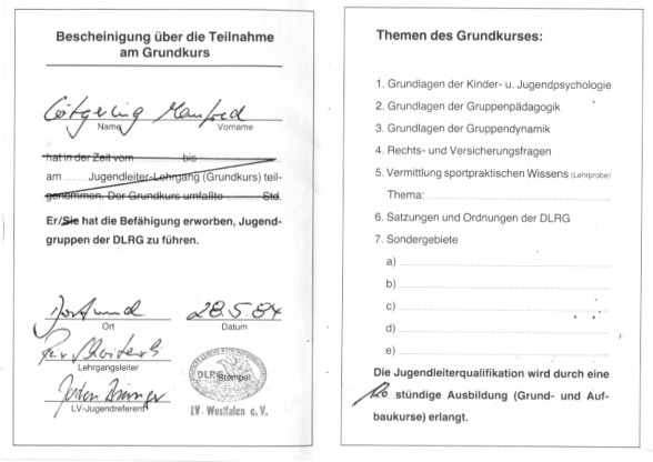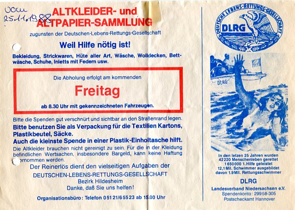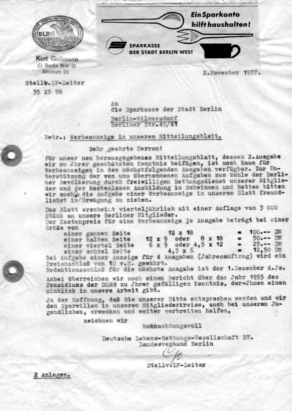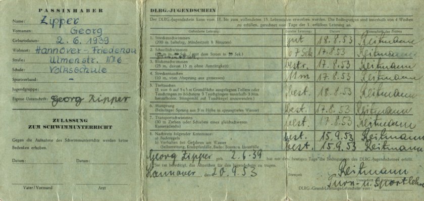 auch: Jahresbericht 1935 und Einladung zur Hauptversammlung 1936 (Broschüre, Druckstück, herausgegeben vom Landesverband Braunschweig e. V. der DLRG). - Bericht über die 8. Haupttagung des DLRG-Landesverbands Baden (vmtl. 1925). - Todesfälle durch Ertrinken (Zeitungsberichte, Juli 1937). - Ankündigung eines Lehrgangs der DLRG (Artikel aus "Nachrichten des Braunschweiger Männer-Turnvereins", Apr. 1938). - Einladung zur Jahreshauptversammlung des Landesverbands Braunschweig e. V. der DLRG am 3. Apr. 1938 (darin: Erwähnung der Anwesenheit des DLRG-Führers Georg Hax). - Erfolgsbericht des Landesverbands Braunschweig für das Jahr 1937 (Ausschnitt aus einer Zeitung). - Todesfälle durch Ertrinken (Zeitungsberichte, Mai - Juli 1938). - "NS-Schwestern als Rettungsschwimmerinnen - Braunschweig als leuchtendes Vorbild - Gemeinschaftsabend im Landeskrankenhaus" (Artikel aus "Braunschweiger Tageszeitung" v. 13. Mai 1938 sowie zugehörige Kurzmeldungen aus weiteren Tageszeitungen, Mai - Juni 1938). - "Jeder Deutsche ein Schwimmer! - Der neue Bezirk Wesertal der DLRG. gegründet - Sitz in Holzminden" (Zeitungsbericht, vmtl. 1938). - "An die DLRG-Lehrschein-Inhaber und Inhaberinnen des Bezirkes Holzminden! (Aufruf des Führers des DLRG-Landesverbands Braunschweig, [Wilhelm] Mönkemeyer, Druckstück, vmtl. 1938). - "An meine lieben D. L. R. G.-Kameraden! (Wünsche für das Jahr 1939, verfasst in Gedichtform von Werner P. Rothe, Führer des DLRG-Landesverbands Thüringen). - Bericht des Bezirks Helmstedt im Landesverband Braunschweig e. V. der Deutschen Lebens-Rettungs-Gemeinschaft e. V. (D. L. R. G.) zur Feier des 10-jährigen Bestehens dieses Bezirks im Mai 1939 (Broschüre, Druckstück, 7 S.). - Einladung zur Jahreshauptversammlung des D. L. R. G.-Landesverbands Braunschweig am 7. Mai 1939 und Programm hierzu (Handzettel, Druckstück). - Jahresbericht 1938 dieses Landesverbands (Druckstück, 4 S.; darin erwähnt: Kooperation mit der SS-Junkerschule Braunschweig [Schule für sog. Junker der SS]). - "Große DLRG.-Flagge für Schöninger Ortsgruppe" [Ortsgruppe Schöningen der D. L. R. G.], Zeitungsbericht, März 1939. - Bericht über die Tagung des D. L. R. G.-Landesverbands Westfalen 1939 (Ausschnitt aus einer Zeitung). - "Arbeitstagung des Bezirks Finsterwalde der DLRG" (Ausschnitt aus einer Zeitung, vmtl. 1939). - Aufruf des Werbeausschusses Schwimmen Niedersachsen zum Erlernen des Schwimmens / Werbewoche im Juni 1951 (Handzettel / Flugblatt, Druckstück; unterzeichnet von Heinrich Hünecke, Ehrenvorsitzender des Werbeausschusses und Vorsitzender des Sportbundes Niedersachsen, N. N. Böhme [vmtl. Ernst Böhme, vormals Oberbürgermeister von Braunschweig], Präsident der Deutschen Gesellschaft für das Badewesen [DGfdB], Franz Klemm, Vorsitzender des Werbeausschusses, Theodor Ahlert, stellvertretender Vorsitzender des Werbeausschusses, und Ernst Kesselhut, stellvertretender Vorsitzender des Werbeausschuses). - Bitte zum Erwerb der korporativen Mitgliedschaft an Unternehmen, Körperschaften, Behörden und Vereine (Aufruf der DLRG-Kreisgruppe Braunschweig, gez. N. N. Beerwald, Kreisgruppenleiter, Umdruck, Apr. 1950). - Wiederaufbau der DLRG-Rettungswache im Bürgerpark Braunschweig, Vorhaben zur Eröffnung der Braunschweiger Rettungsschimmerschule und Bitte um Unterstützung der Arbeit der DLRG (Aufruf des DLRG-Landesverbands Braunschweig, Flugblatt, Druckstück, vmtl. 1951). - DLRG-Werbewoche in Hildesheim (Ausschnitt aus der Hildesheimer Zeitung, vmtl. Juni 1951). - "Jugend im Kampf gegen den nassen Tod" (Ausschnitt aus der Hildesheimer Zeitung, 11. Juni 1951; dabei: Fotografie von Otto Immendorff / Immendorf). - Arbeitsbericht des DLRG-Landesverbands Braunschweig für das Jahr 1951 (Druckstück). - Einweihung der neu erstandenen Rettungsschwimmerschule im Bürgerpark Braunschweig (Ausschnitt aus einer am 26. Mai 1952 erschienenen Zeitung). - Wiedereröffnung der Rettungsstation des DLRG-Bezirks Heidelberg auf dem Neckarvorland (Ausschnitt aus einer am 10. Juni 1952 erschienenen Zeitung). - Abhaltung von Ausbildungskursen im Rettungsschwimmen in den Stadtbädern Schöneberg, Tiergarten, Neukölln, Spandau und Kreuzberg (Handzettel, Druckstück, herausgegeben vom DLRG-Landesverband Berlin ca. 1952). - Informationen über die Arbeit des DLRG-Landesverbands Braunschweig und des DLRG-Bezirks Braunschweig in den Jahren 1952 bis 1956 (dabei: Ehrung des Lebensretters Heinz Hanebuth [Febr. 1953]; Ernennung von Oberstadtdirektor [Erich Walter] Lotz, Braunschweig, zum Ehrenmitglied der DLRG und Übergabe der Urkunde durch DLRG-Präsidialgeschäftsführer Dr. Robert Goldenring sowie Verleihung der Goldenen Ehrennadel der DLRG an den Schwimmer und "Weltrekordler" Ete [Erich] Rademacher, Febr. 1953; Auszeichnung von Jörg Banse, Konrad Wicke, Hans Richter und Gerd Lühr für Rettung von Menschen vor dem Ertrinkungstod durch Herbert Falk, Vorsitzender des DLRG-Bezirks Braunschweig, März 1954). - "Die Paddelpartie - Eine nachdenkliche Geschichte" (bebilderte Broschüre, Druckstück, Graphiken von N. N. Lehnert, vmtl. herausgegeben vom DLRG-Landesverband Niedersachsen, ca. 1953). - "Das DLRG-Heim in Pelzerhaken - Eine Erläuterung der DLRG" (Ausschnitt aus einer Zeitung, ca. 1953). - Spendenaufruf des DLRG-Bezirks Braunschweig (Faltblatt / Flyer, Druckstück, ca. 1954). - "Polizeisportler Braunschweigs grüßen die DLRG" (Erneuerung des korporativen Anschlusses an die DLRG [vmtl. als DLRG-Ortsgruppe Polizei im DLRG-Bezirk Braunschweig], 1954). - "DLRG-Lied" (Postkarte, Druckstück, ca. 1954). - "Was wollen wir?" (Faltblatt / Flyer, herausgegeben vom Deutschen Werbeausschuss Schwimmen und Retten e. V. [DWA], Schirmherr Wilhelm Daume, Präsident des Deutschen Sportbundes - DSB, ca. 1954). - "Die ersten Rettungsschwimmer in Meinersen" (Ausschnitt aus einer Zeitung, 3. Okt. 1955). - "Kampf dem nassen Tod! - DLRG-Ortsgruppe jetzt auch in Gifhorn" (Ausschnitt aus einer Zeitung, ca. 1955 oder 1956). - "Die Rettung
